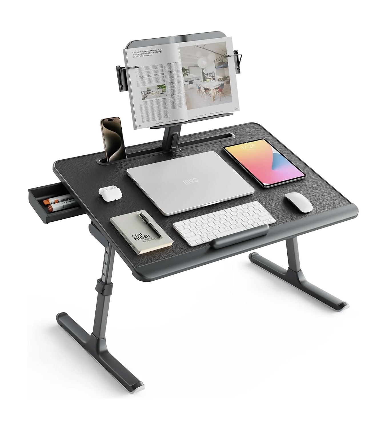 حتی در حالت شیب‌دار، میز کاملاً پایدار باقی می‌ماند و گیره فلزی نگهدارنده کتاب از افتادن صفحات جلوگیری کرده و فشار وارد بر گردن را به حداقل می‌رساند؛ نتیجه؟ تجربه‌ای راحت و بدون خستگی در مطالعه طولانی‌مدت.