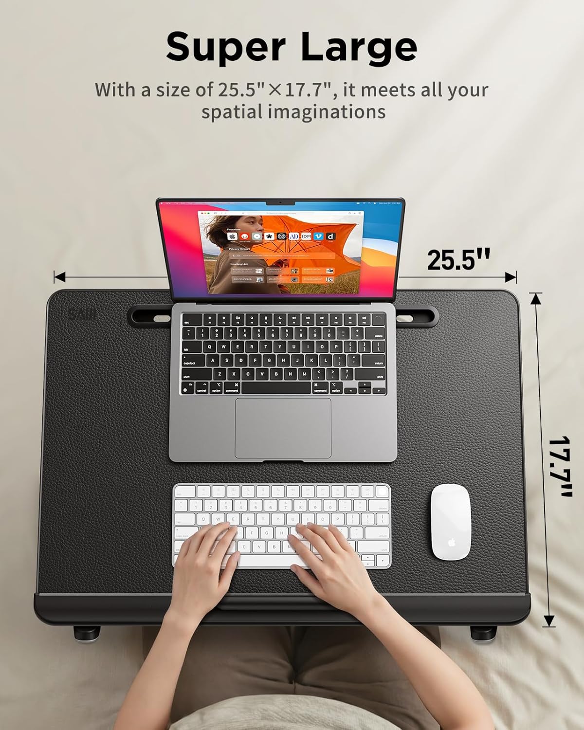 این میز به یک صفحه‌ی بزرگ با ابعاد 64 × 44 سانتی‌متر مجهز شده که فضای کافی برای قرار دادن هم‌زمان لپ‌تاپ، کتاب، موس، موبایل و سایر لوازم را فراهم می‌کند. طراحی عریض آن باعث می‌شود بتوانید به‌راحتی روی مبل، تخت، پشت میز، به‌صورت ایستاده یا حتی روی زمین کار کنید، بدون احساس کمبود فضا.